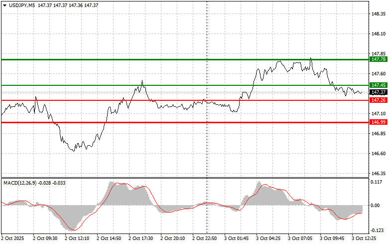 السيناريو #1: أخطط لشراء USD/JPY اليوم عند نقطة الدخول 147.45 (الخط الأخضر على الرسم البياني)، مستهدفًا النمو إلى 147.78 (الخط الأخضر الأثخن على الرسم البياني). حول 147.78، سأخرج من صفقات الشراء وأفتح صفقات بيع في الاتجاه المعاكس (متوقعًا انعكاسًا بمقدار 30-35 نقطة من المستوى). يمكن توقع ارتفاع في الزوج فقط في حالة وجود بيانات أمريكية قوية جدًا. مهم: قبل الشراء، تأكد من أن مؤشر MACD فوق علامة الصفر ويبدأ في الارتفاع منها.