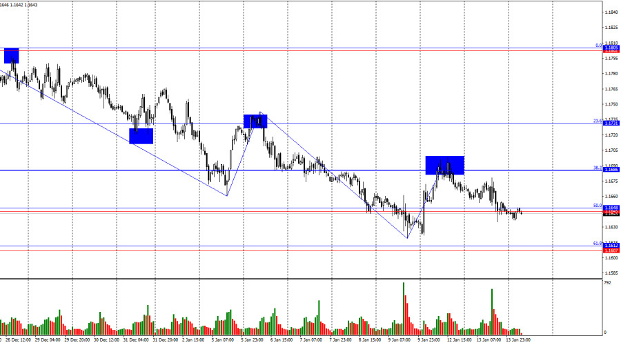 يوم الثلاثاء، واصل المتداولون الهابطون ممارسة الضغط. بالكاد يمكن وصف هجماتهم اليومية بأنها هجمات بالمعنى الحرفي، حيث يرتفع الدولار بوتيرة بطيئة جدًا - ولكن تقريبًا كل يوم. بالأمس، تفاعل المتداولون مع تقرير التضخم الأمريكي المحايد. وفقًا لهذا التقرير، بقي المؤشر الرئيسي عند 2.7% سنويًا، بينما بقي التضخم الأساسي عند 2.6% سنويًا. وبالتالي، لم يتم تسجيل أي تغييرات، ولكن عدم التغيير يدعم حاليًا الدببة. إذا لم يستمر التضخم في الانخفاض، فإن لدى الاحتياطي الفيدرالي أسباب أقل لمزيد من التيسير النقدي. هذا بالتأكيد استنتاج مثير للجدل، ولهذا السبب كانت ردود فعل المتداولين ضعيفة جدًا. ومع ذلك، أود أن أشير إلى أن دونالد ترامب قد أعلن هذا الأسبوع بالفعل عن تعريفات تجارية جديدة لجميع الدول التي تتاجر مع إيران، كما يستعد لهجوم على إيران نفسها دعمًا للمتظاهرين. كان هناك المزيد من الأخبار الأسبوع الماضي، ومع ذلك، لا تزال نشاطات التداول منخفضة جدًا. في ظل الأحداث الأخرى، يمكن اعتبار رد فعل السوق على تقرير التضخم يوم الثلاثاء مقنعًا نسبيًا.
