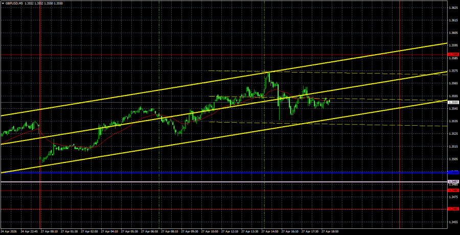 على الإطار الزمني لخمس دقائق، لم يتم توليد أي إشارات تداول يوم الاثنين. تحرك الزوج بالقرب من خطوط مؤشر Ichimoku لكنه لم يُظهر أي تفاعل يُذكر معها. وبالتالي، لم يكن لدى المتداولين ما يستندون إليه للدخول في السوق خلال تداولات الأمس.