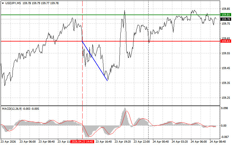 পরিকল্পনা #1: আজ এই পেয়ারের মূল্য শুধুমাত্র 159.74-এর (চার্টে হালকা লাল লাইন) লেভেল ব্রেক করে নিম্নমুখী হওয়ার পর USD/JPY পেয়ার বিক্রি করার পরিকল্পনা করছি, যা এই পেয়ারের দ্রুত দরপতনের দিকে নিয়ে যাবে। বিক্রেতাদের জন্য মূল লক্ষ্যমাত্রা হবে 159.43-এর লেভেল (গাঢ় লাল লাইন), যেখানে আমি শর্ট পজিশন ক্লোজ করতে যাচ্ছি এবং অবিলম্বে বিপরীত দিকে লং পজিশন ওপেন করতে যাচ্ছি, সেই লেভেল থেকে বিপরীত দিকে 20-25 পিপস রিবাউন্ডের আশা করছি। যতটা সম্ভব উচ্চ লেভেলে থাকা অবস্থায় এই পেয়ার বিক্রি করা উচিত হবে, বিশেষ করে ইয়েনের মূল্য 160-এর লেভেলের কাছাকাছি থাকা অবস্থায়। গুরুত্বপূর্ণ! এই পেয়ার বিক্রি করার আগে, নিশ্চিত করুন যে MACD সূচকটি শূন্যের নিচে রয়েছে এবং সবেমাত্র শূন্যের নিচে নামতে শুরু করেছে।