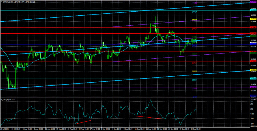 Към 2 октомври средната волатилност за EUR/USD през последните пет търговски дни е 65 пипса - сметнато за "умерено". Очакваме двойката да се движи между нивата 1.1657 и 1.1797 в четвъртък. Дългосрочният канал на линейната регресия сочи нагоре, указвайки, че по-широкият възходящ тренд продължава да е в сила. Индикаторът CCI влезе в зоната на прекупуване, задействайки текущия етап на намаляване на корекцията.