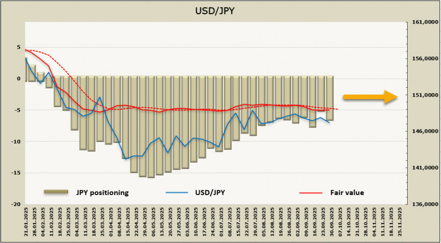 Нетните дълги позиции върху йената нараснаха значително с $1.49 милиарда през отчетната седмица, достигайки $6.73 милиарда — което бележи края на процеса на развиване, който започна през април. Оценената справедлива стойност остава под дългосрочната средна стойност, което предполага продължаващ потенциал за понижение на USD/JPY, въпреки че инерцията остава слаба.