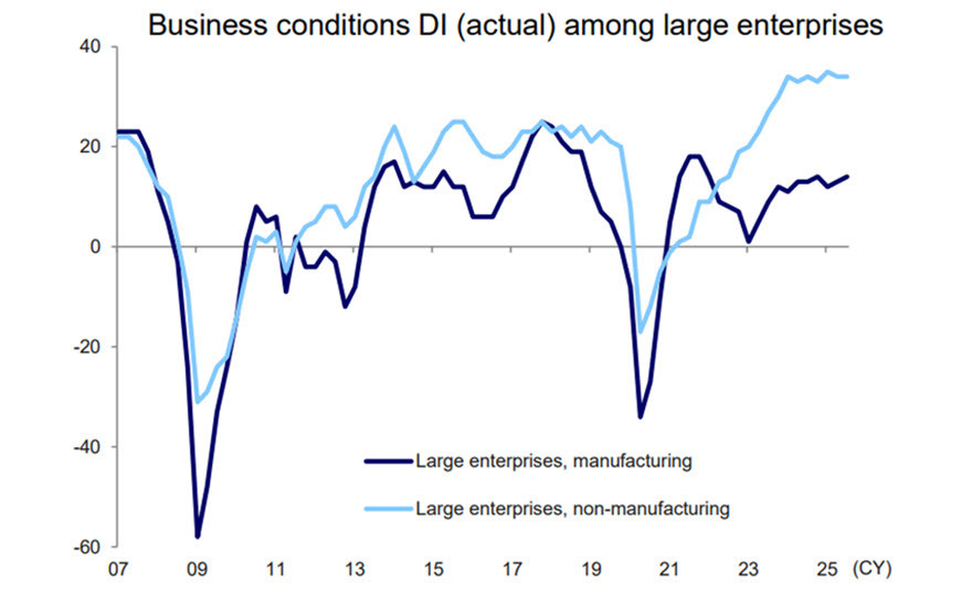 Резултатите от анкетата Tankan на Bank of Japan (BoJ) за септември, публикувани на 1 октомври, показаха подобрение в индекса на бизнес условията (DI) с 1 пункт в сравнение с юни за големите производители, достигайки +14. Индексът за големите непроизводствени фирми остава на много високо ниво от +34.