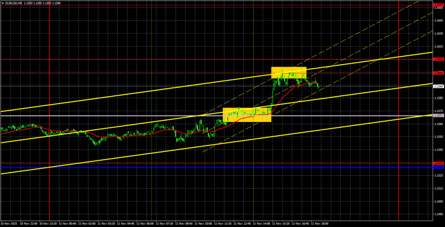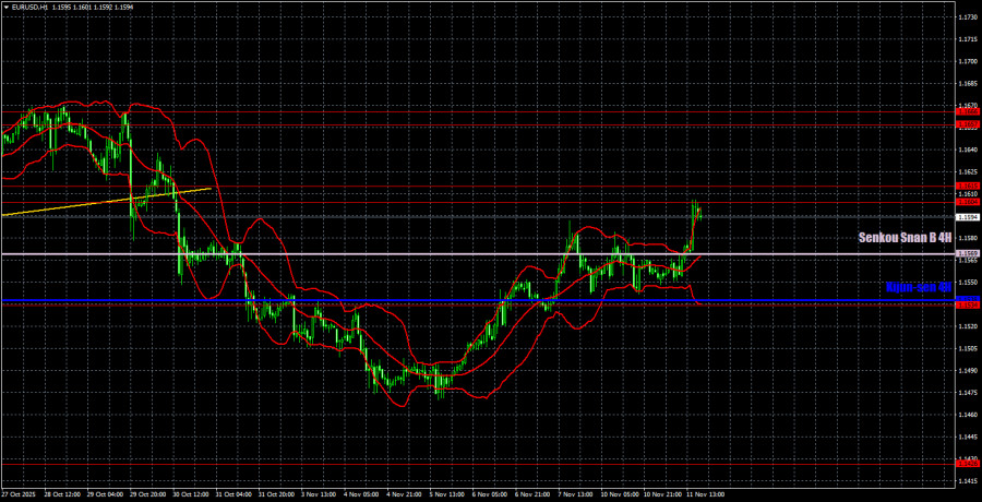 Валутната двойка EUR/USD продължи възходящото си движение във вторник, както се очакваше. Въпреки липсата на значими събития вчера и очакванията, че новините за предстоящия край на блокирането ще укрепят долара, пазарът продължи да купува еврото. Дали това е нелогично? Точно както беше нелогично да видим покачването на долара през октомври по време на продължаващото блокиране и заедно с новите мита от Тръмп. Двойката EUR/USD остава в странично движение на дневната графика, което обяснява всичко. При последния спад цената достигна до долната граница на диапазона от 1.1400–1.1830 и се покачва вече четири дни. Следователно може да се предположи, че нелогичният спад на двойката е приключил и предстои логично покачване.