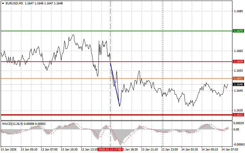 當價位在 1.1659 附近進行測試時,MACD 指標才剛開始從零線向下移動,這確認了一個有效的做空歐元進場點。因此,該貨幣對下跌超過 25 點。