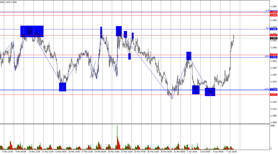 波浪形勢再度轉為偏多。最新一個向上的波段已突破前高,而前一個完成的向下波段並未跌破前低。過去兩個月中,地緣政治幾乎讓空頭在市場上擁有全面主導權,但如今地緣政治背景開始好轉,立即提振了多頭的信心。從小時圖來看,近幾週內該貨幣對一直在 1.3177 至 1.3465 的區間內盤整。
