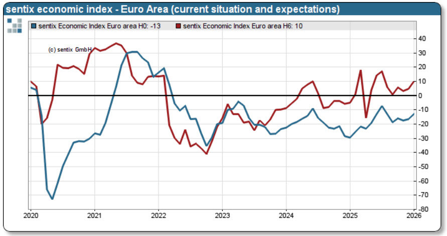 L'indicateur de confiance des investisseurs Sentix a augmenté de 4,4 points en janvier pour atteindre -1,8, son niveau le plus élevé depuis juillet 2025. Cette hausse de l'indice est principalement due à une augmentation des attentes, qui sont devenues beaucoup plus positives; l'évaluation de la situation actuelle reste faible mais montre également une tendance à la hausse.