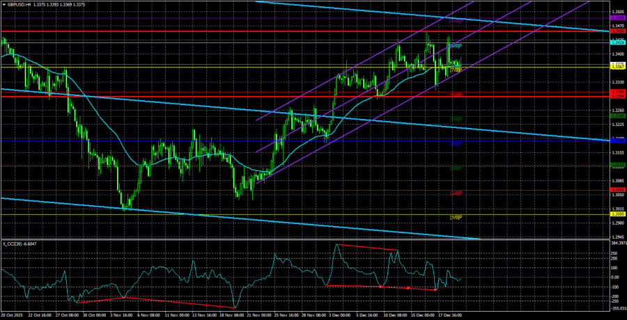 The average volatility of the GBP/USD pair over the last five trading days is 81 pips, which is considered "medium." We expect the pair to trade between 1.3294 and 1.3456 on Monday. The upper linear regression channel is pointing down, but it is only due to a technical correction on higher timeframes. The CCI indicator has entered the oversold area 6 times in recent months and has formed numerous bullish divergences, consistently signaling a resumption of the upward trend. This week, the indicator formed yet another bullish divergence, but previously there had been two entries into the overbought area and a bearish divergence. The pound is confidently moving toward another flat.