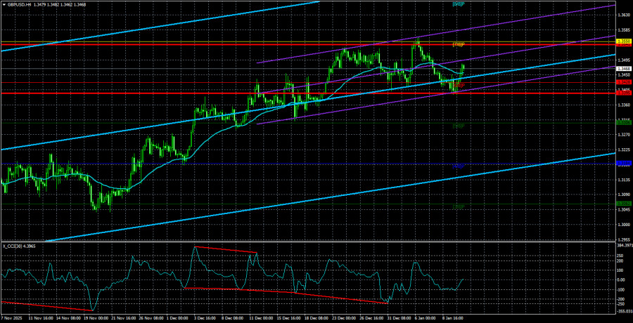 Average volatility of the GBP/USD pair over the last 5 trading days is 73 pips. For the pound/dollar pair, this value is "medium." On Tuesday, January 13, therefore, we expect movement within a range bounded by levels 1.3395 and 1.3541. The higher linear regression channel has turned upward, indicating a trend recovery. The CCI indicator entered the oversold area 6 times over recent months and formed numerous "bullish" divergences, which have consistently warned traders of a continuation of the upward trend.