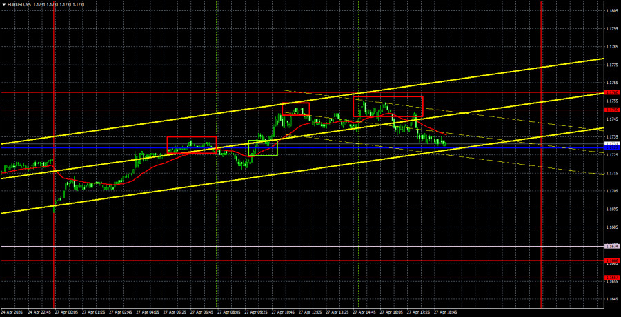 The EUR/USD currency pair attempted to extend its upward move on Monday but ran into an insurmountable barrier in the 1.1750-1.1760 area. Recall that the pair previously broke the trend line, so the trend has formally changed to downward. However, earlier, the Senkou Span B line was below, which led us to doubt the continuation of the upward trend. Now the line is above the price, thus acting as resistance. Therefore, the chances of a new downward trend are increasing. There was no macroeconomic or fundamental backdrop on Monday, nor were there any geopolitical events. The pair moved purely based on technical factors throughout the day.