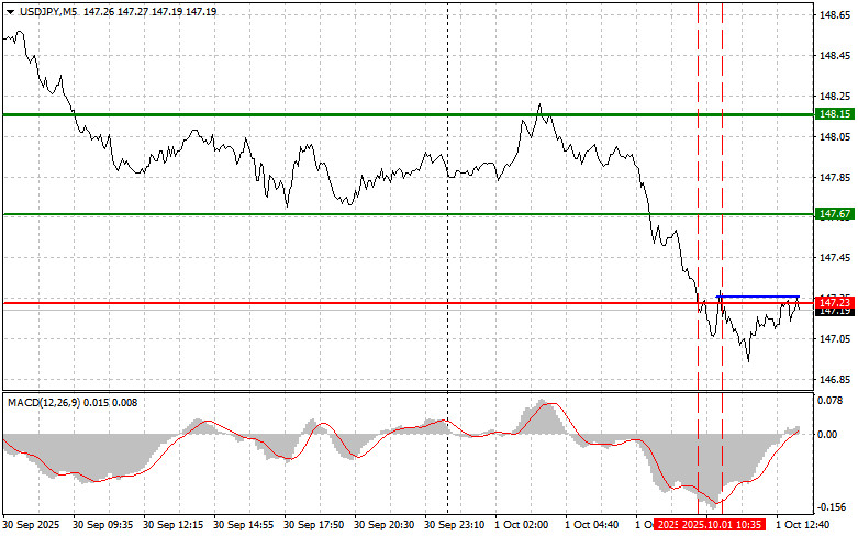 Cenário 1: Hoje, pretendo vender USD/JPY após uma quebra abaixo de 147,04 (linha vermelha no gráfico), o que provocaria uma queda rápida. A meta principal de baixa será 146,66, onde sairei das posições de vendas e abrirei imediatamente posições de compras na direção oposta (esperando uma retração de 20 a 25 pontos). A pressão de venda pode persistir se os dados forem fracos. Importante! Antes de vender, certifique-se de que o indicador MACD esteja abaixo de zero e apenas começando a cair a partir desse nível.