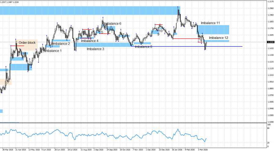 No momento, os vendedores podem receber um sinal a partir do desequilíbrio 12 e, como a tendência de alta está próxima de ser rompida, esse sinal deve ser levado a sério. Já os compradores só podem contar com capturas de liquidez nas mínimas de 1,1470 e 1,1392, com a invalidação do desequilíbrio 12, com a formação de novos padrões de alta e com o surgimento de novos sinais de compra.
