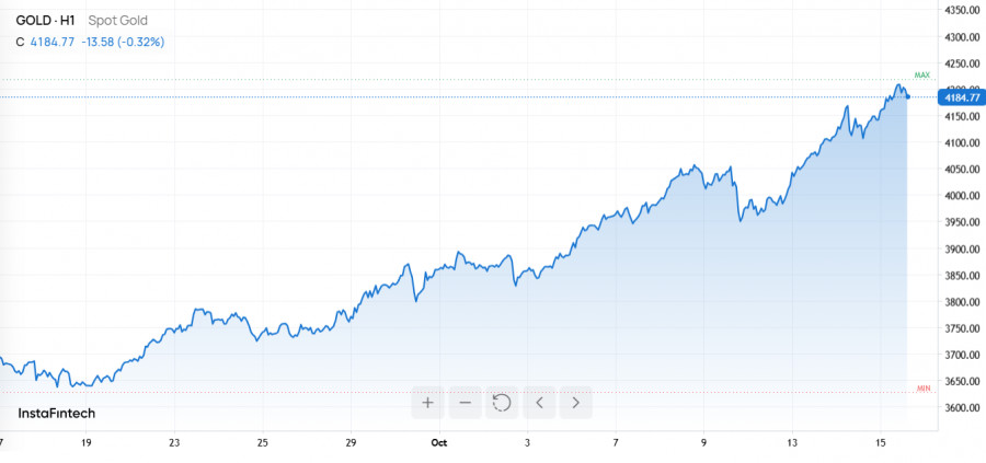 Спотовое золото подскочило на 1,1% и к 09:05 по московскому времени торговалось на уровне $4 186,84 за унцию. Исторический максимум составил $4 193,6. Декабрьские фьючерсы на золото в США не отставали – плюс 1% до $4 203,27. На фоне этого «золотого бума» драгоценный металл демонстрирует рост уже восемь недель подряд. Если такой темп сохранится, то неделя завершится очередным всплеском.