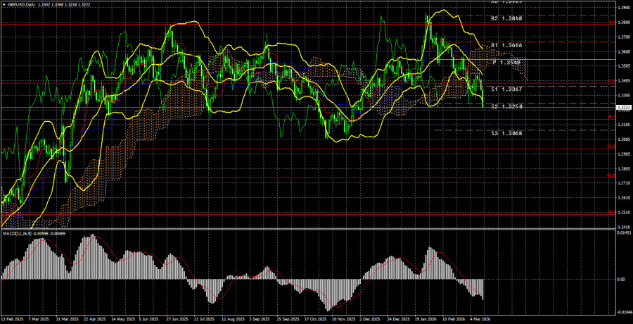 Валютная пара GBP/USD в пятницу также продолжала практически обвальное падение. Британский фунт с февраля-месяца подешевел уже на 630 пунктов. Поначалу движение вниз выглядело, как банальная коррекция или даже откат. Однако в феврале целая серия слабых отчетов из Великобритании поддержала продолжение южного направления движения. Ну а в начале марта началась война на Ближнем Востоке, и на этот раз расти начал уже доллар США. А совокупность этих событий обошлась британской валюте потерей 6 центов стоимости.