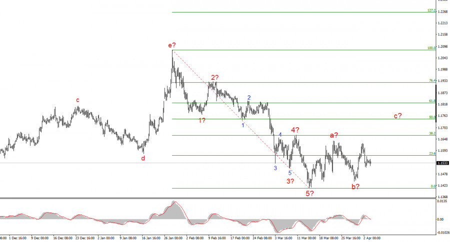 На картинке выше я могу выделить классическую пятиволновую импульсную структуру волн с удлинением в третьей волне. Если это действительно так, то построение этой структуры завершено, а нас ожидает построение коррекционного набора минимум на три волны. Следовательно, в ближайшее время стоит ожидать повышения котировок инструмента, но уже в рамках коррекции относительно последнего участка тренда. Пока что последние волновые структуры очень плохо вписываются в старшую разметку, но со временем ситуация прояснится. В ближайшее время можно ожидать восстановления европейской валюты к отметкам 1,1666 и 1,1745.