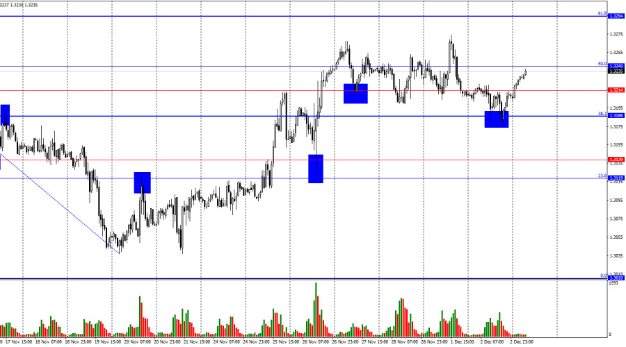 Không có tin tức cơ bản nào liên quan đến đồng bảng Anh hoặc đồng đô la vào thứ Ba. Trong khi đó, đồng euro có hai báo cáo thú vị, nhưng thị trường đã phớt lờ chúng. Do kết quả, đồng bảng Anh và đồng đô la không bị mất mát gì. Xu hướng tăng tổng thể vẫn tiếp tục trước cuộc họp cuối cùng của FOMC năm 2025, nhưng các nhà giao dịch vẫn thận trọng, vì không có dữ liệu cập nhật về thị trường lao động hay tỷ lệ thất nghiệp từ Mỹ. Nhớ rằng, do "shutdown," Cục Thống Kê đã ngừng hoạt động trong một tháng rưỡi và vẫn chưa thu thập dữ liệu cho tháng Mười và tháng Mười Một. Vì vậy, không có thông tin hiện tại về điều kiện thị trường lao động. Không có thông tin này, Cục Dự trữ Liên bang sẽ phải đưa ra quyết định chính sách tiền tệ gần như mù quáng. Báo cáo duy nhất có thể cung cấp cho FOMC ít nhất một số hướng dẫn là báo cáo ADP, sẽ có sẵn ngày hôm nay. Theo dự báo, số lượng việc làm mới trong tháng Mười Một sẽ là 5,000—thấp hơn nhiều so với con số 42,000 trong tháng Mười, vốn đã được xem là cực kỳ thấp. Do đó, thị trường có mọi lý do để tiếp tục bán đồng đô la.